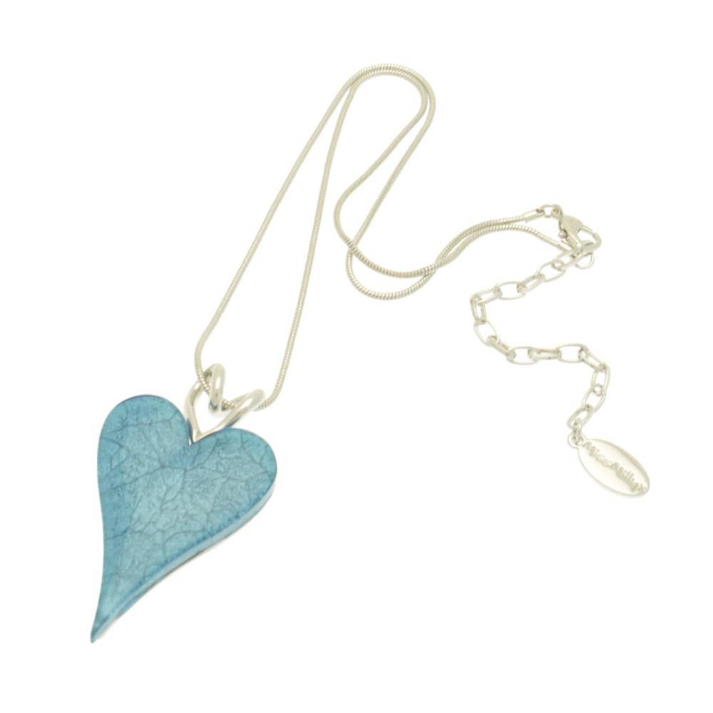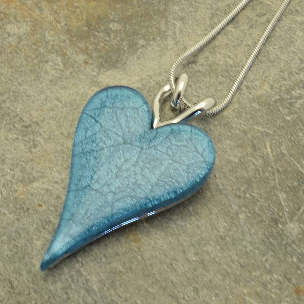 In a pretty, sky blue marbled resin, this lovely heart pendant has a second silver heart to hang from. The full pendant measures approx 2.8cm wide by 5.5cm high. The necklace measures 41cm or 16" long and fastens with a lobster clasp and 8cm extension chain.