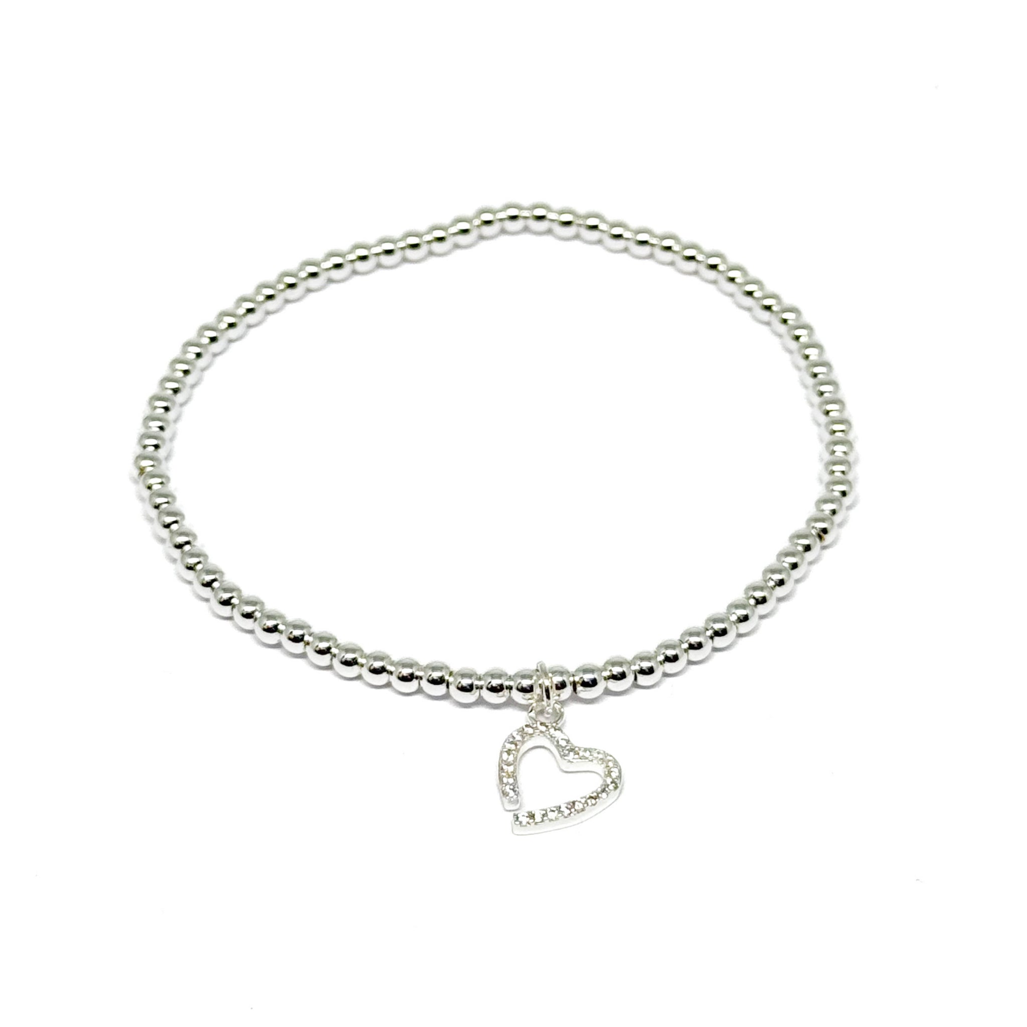 Silver sparkle heart charm on a silver beaded stretch bracelet.