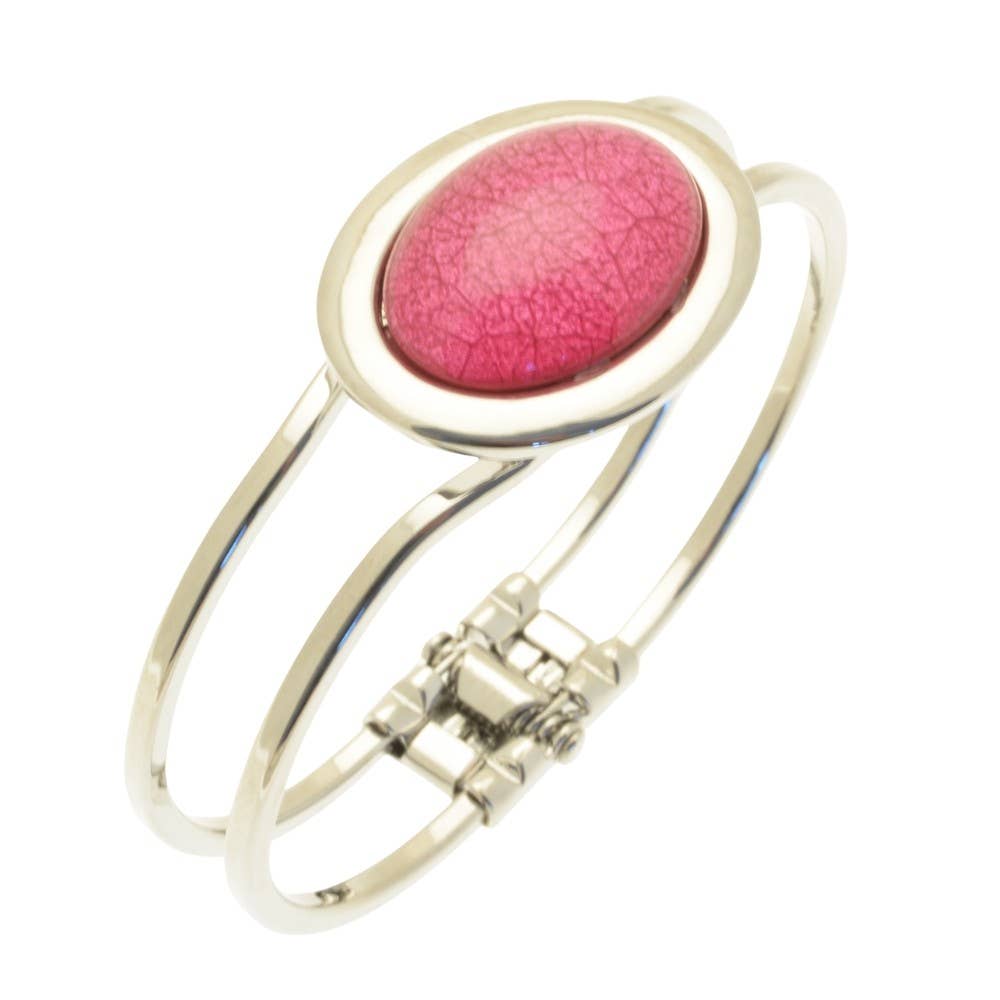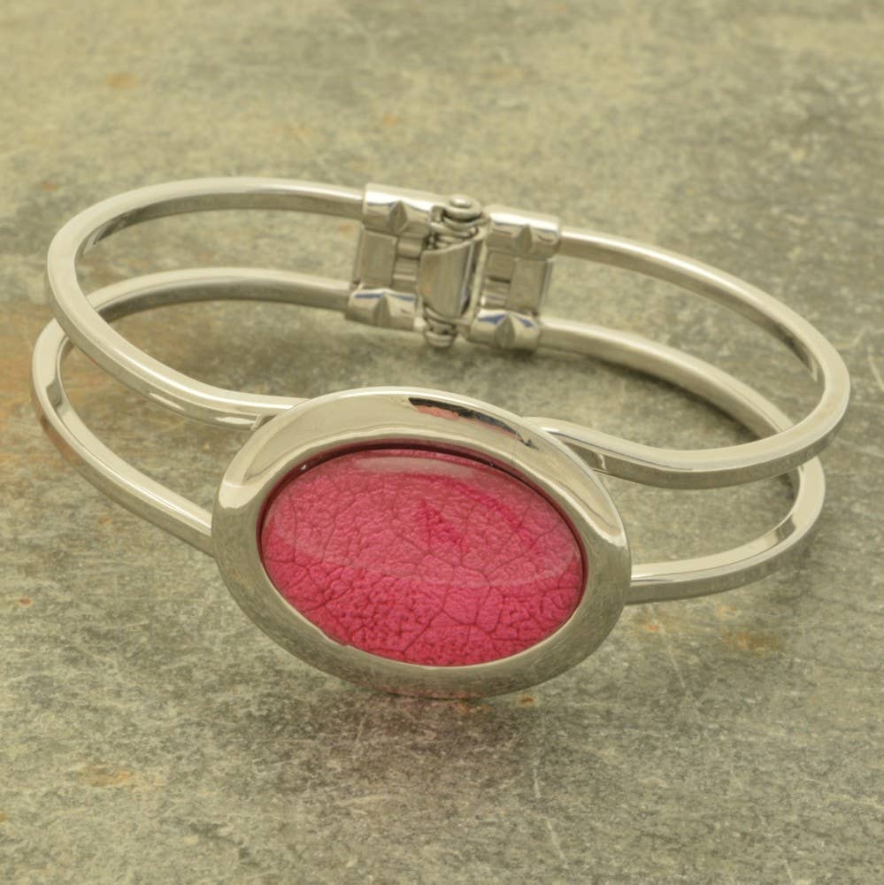 This mid pink bangle is our most popular style of bracelet and uses a resin backed with marbled paper, which gives it an illusion of depth and texture. It has a hinged clasp making it a universal fit. The oval decoration measures approx 3cm by 2.5cm.