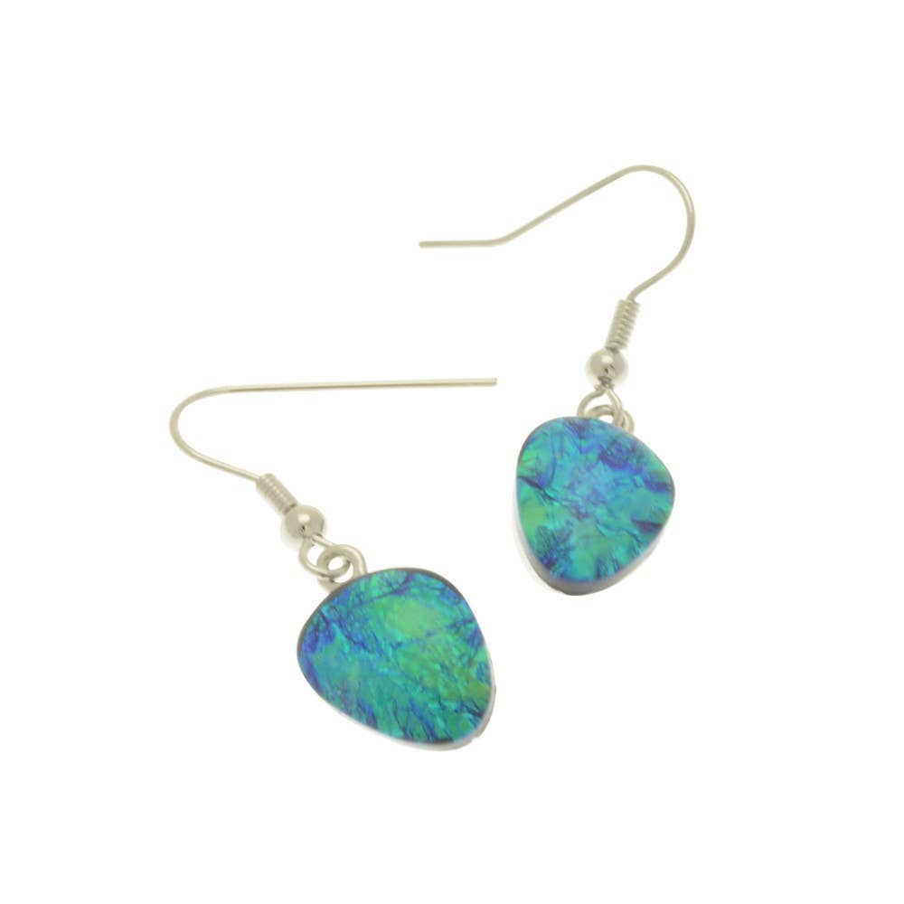 Rich, green-blue iridescent resin pebbles hang from fishhook earrings. The pebbles measure 1.3cm high by 1.2cm wide. The resin is backed with an iridescent paper, giving it lustre and colour-changing, opalescent properties.