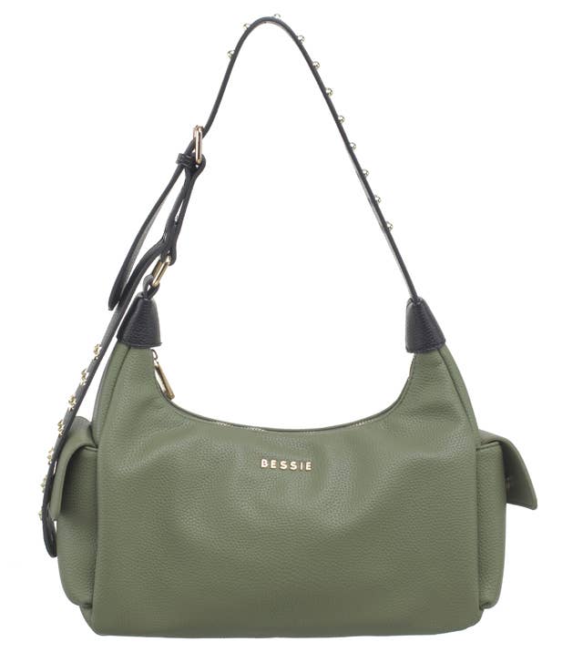Features: Shoulder Bag | Studded | Fully Lined Interior | Adjustable Long Strap | Zip Closure | Cargo