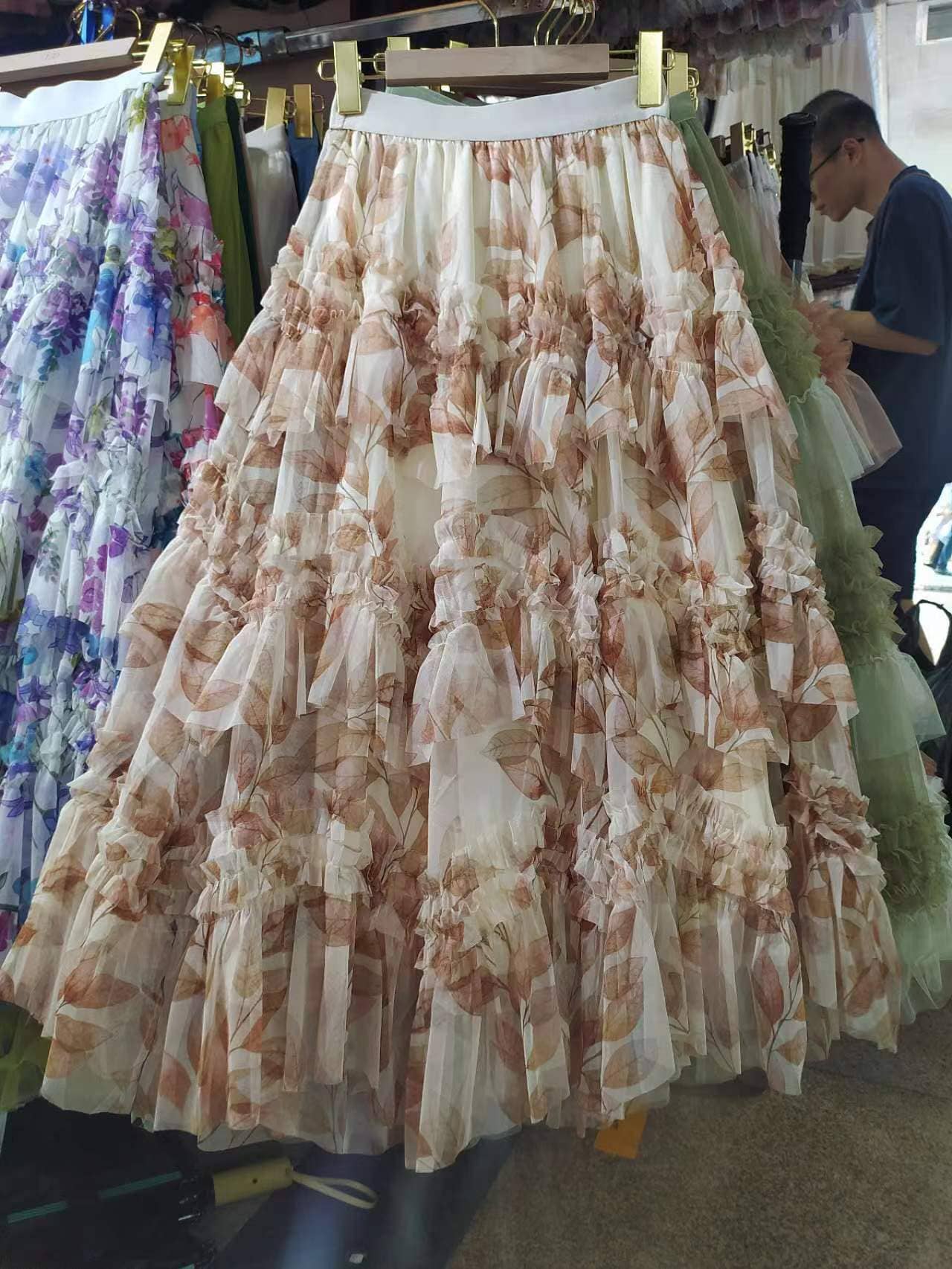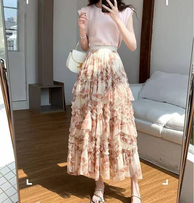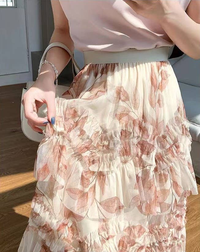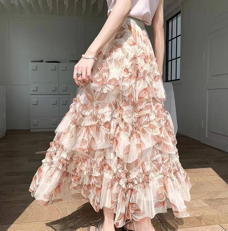 Romantic Flowers Ruffle Maxi Skirt: Cream