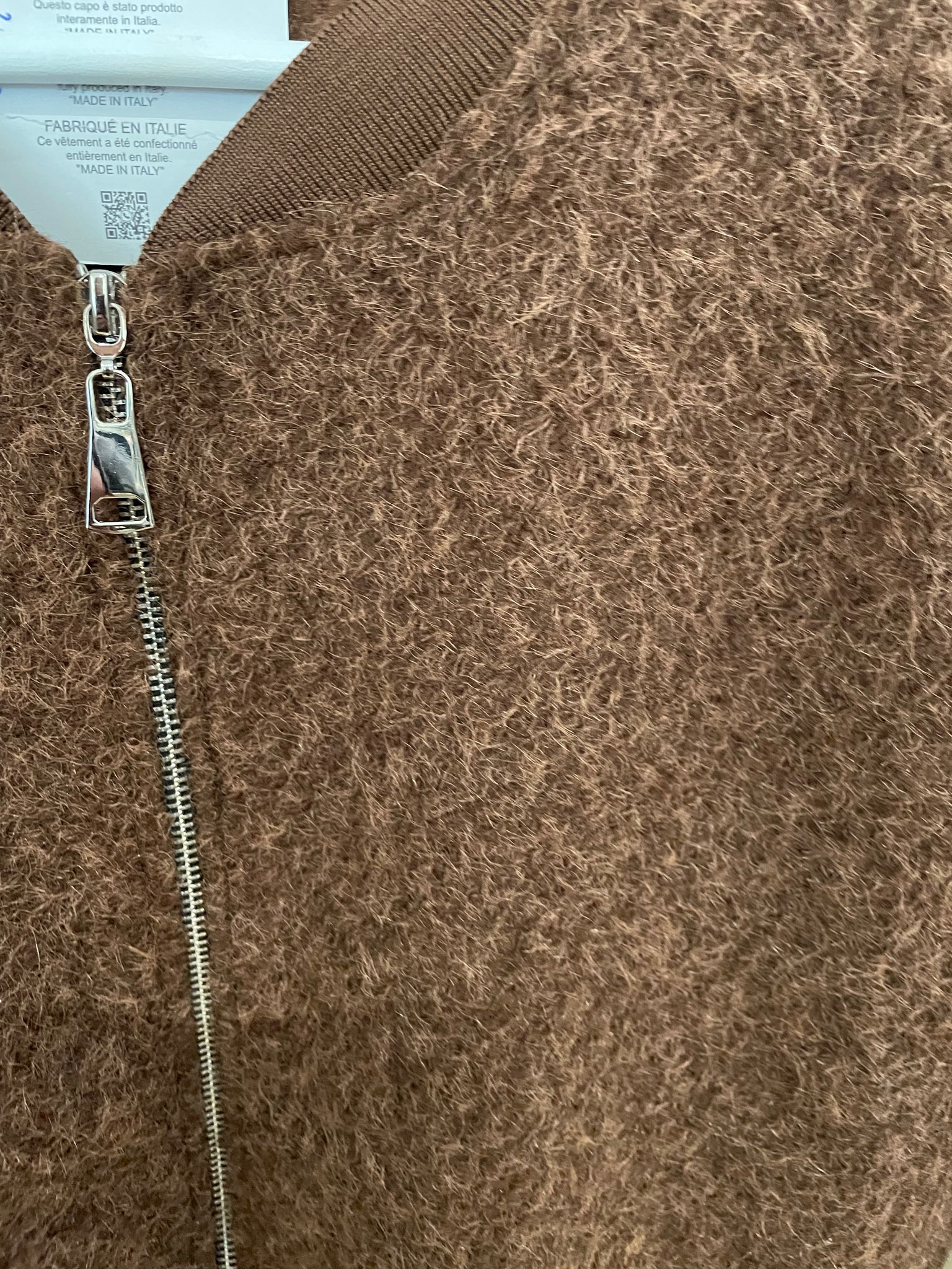 Chocolate brown textured bomber jacket, zip through front, pockets to side.