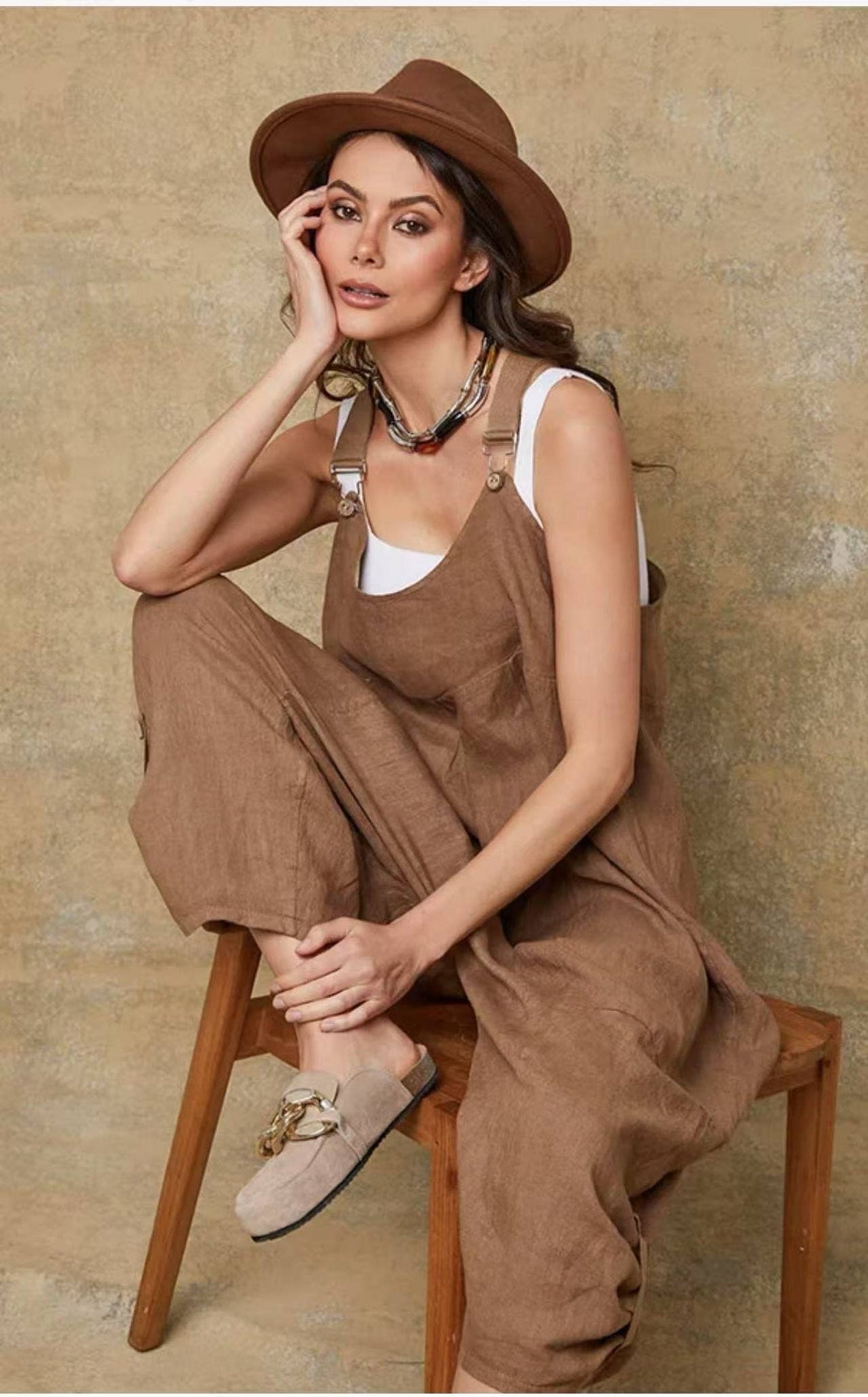 100% linen jumpsuit in a bohemian and relaxed style offers a loose and fluid fit for optimal comfort. Featuring adjustable straps with metal buckles and a buttoned side pocket, it combines practicality and elegance. Its slightly asymmetrical hem enhances its modern look. Ideal for a casual chic look, it pairs easily with a fitted top and light shoes.