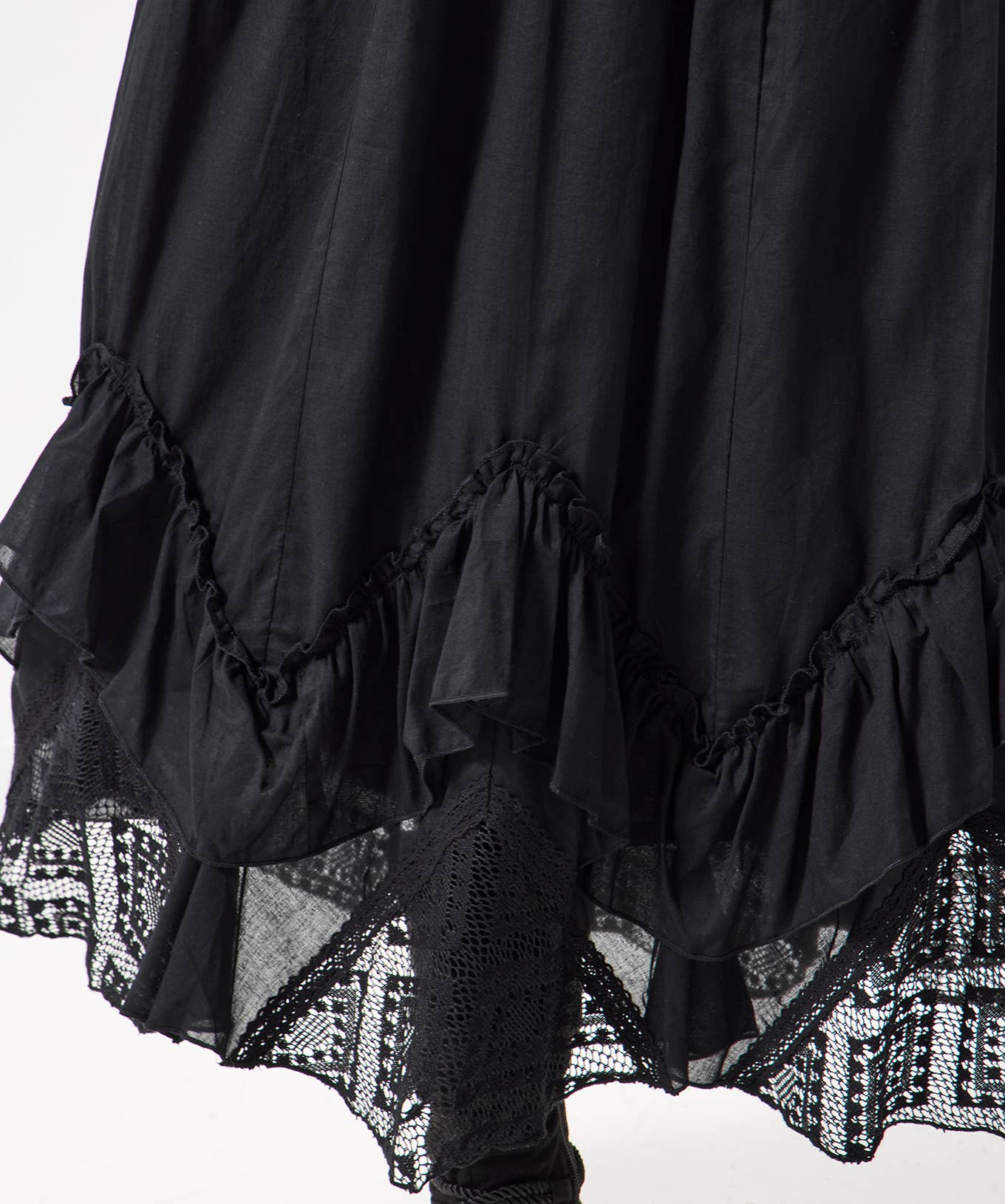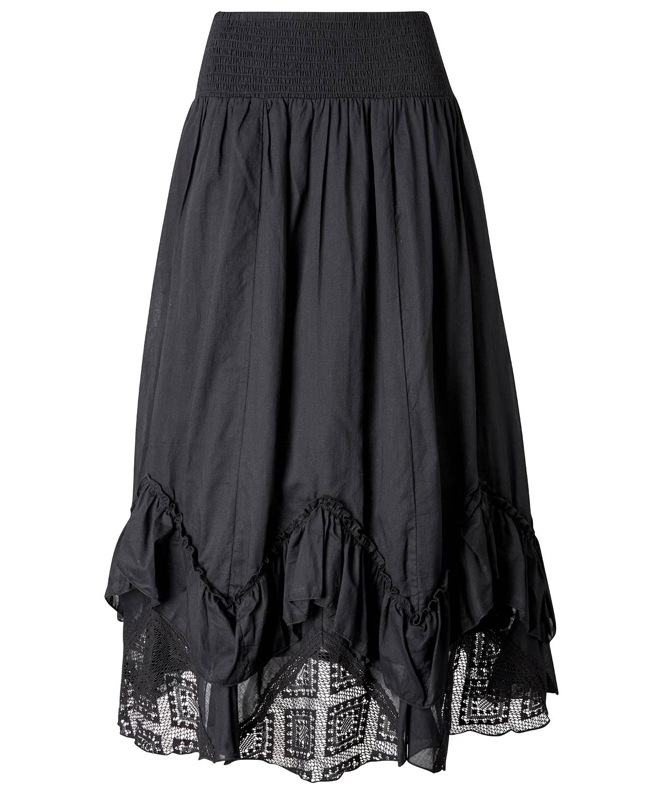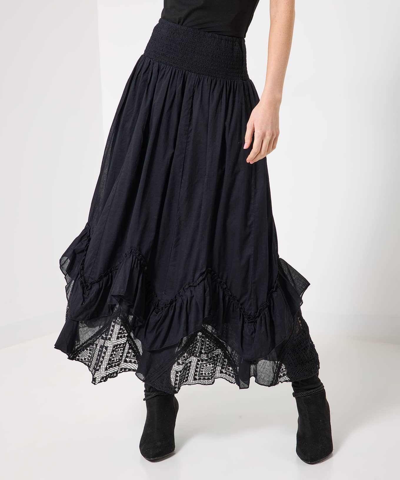 *Maxi length *versatile black, easy to style *lace godets add texture and interest *shirred waistband for comfort/flattering fit *flowing silhouette for dramatic flair *perfect for edgy boho inspired outfits