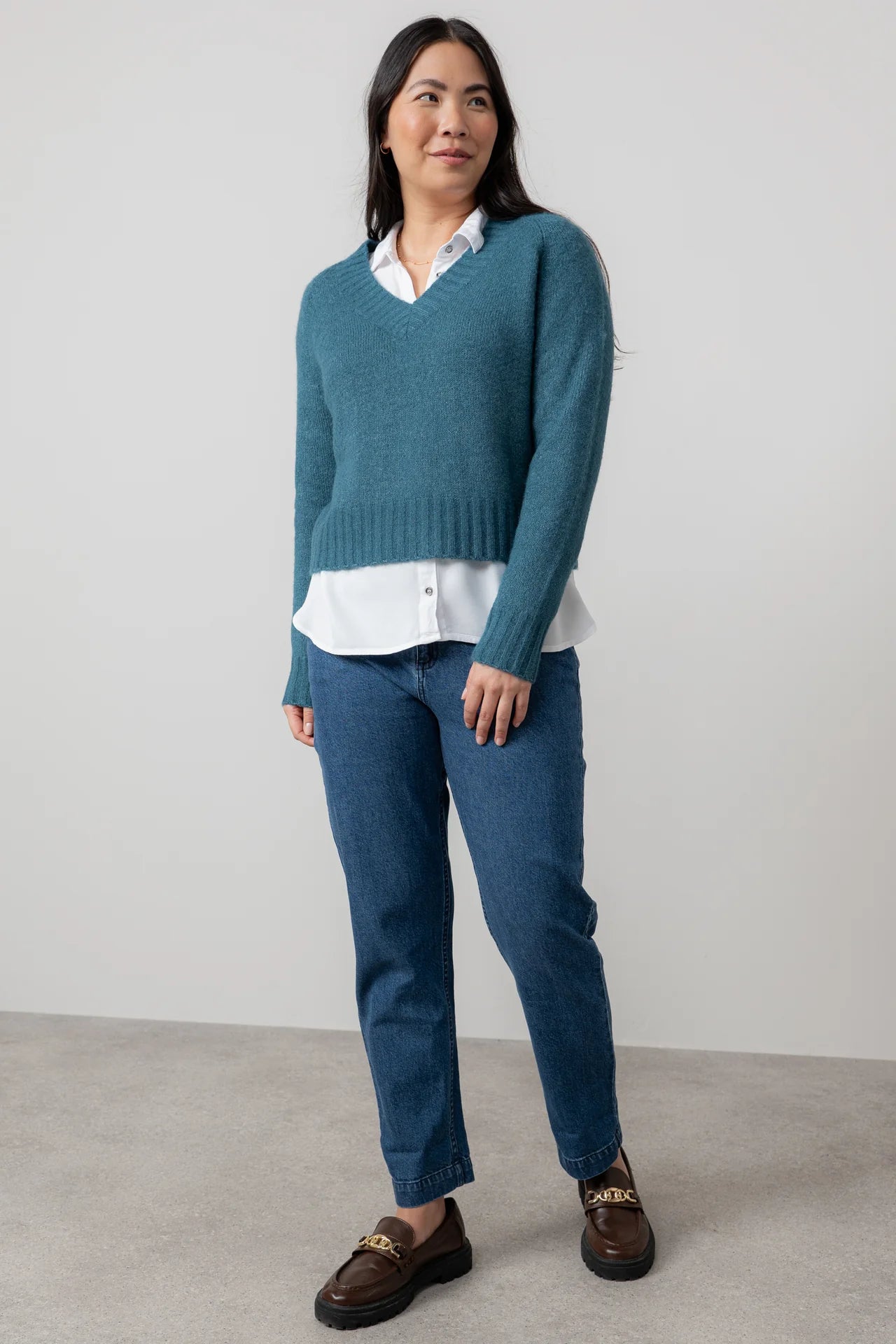 An easy outfitter, the Woodchester Jumper is a boxy, v-neck jumper in a blended yarn with a touch of alpaca for a soft handfeel.