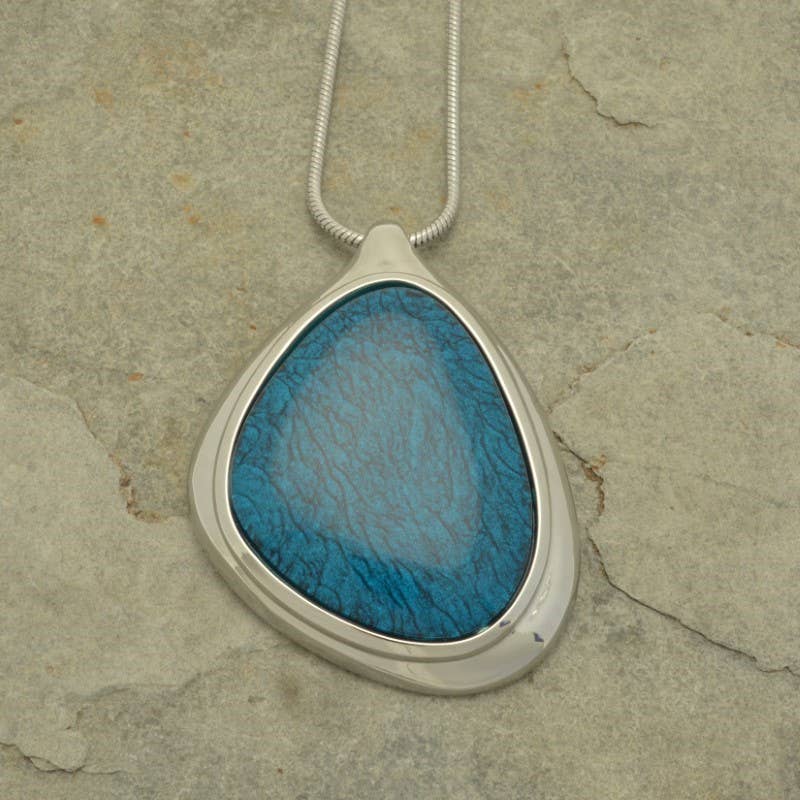 In our beautiful mid, denim blue marbled resin, this is one of only a few long necklaces we supply. The asymmetric shape and scalloped silver frame adds to it charm. The pendant measures 6cm long by 4.5cm wide and hangs from a 75cm snake chain with 5cm extender.
