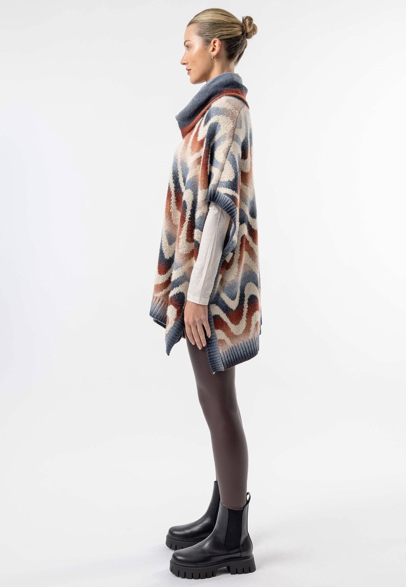 Snuggle up in this cosy Californian Roll Neck Batwing Poncho by ANGELEYE. Throw over this poncho for an easy, cold season look with fun style. Femininity flows through this poncho with batwing and roll neck details. The thick knit in a Californian print inspired by dusty deserts and the sea gives country-fall vibes. Style with denim for everyday wear or tailored trousers for work.