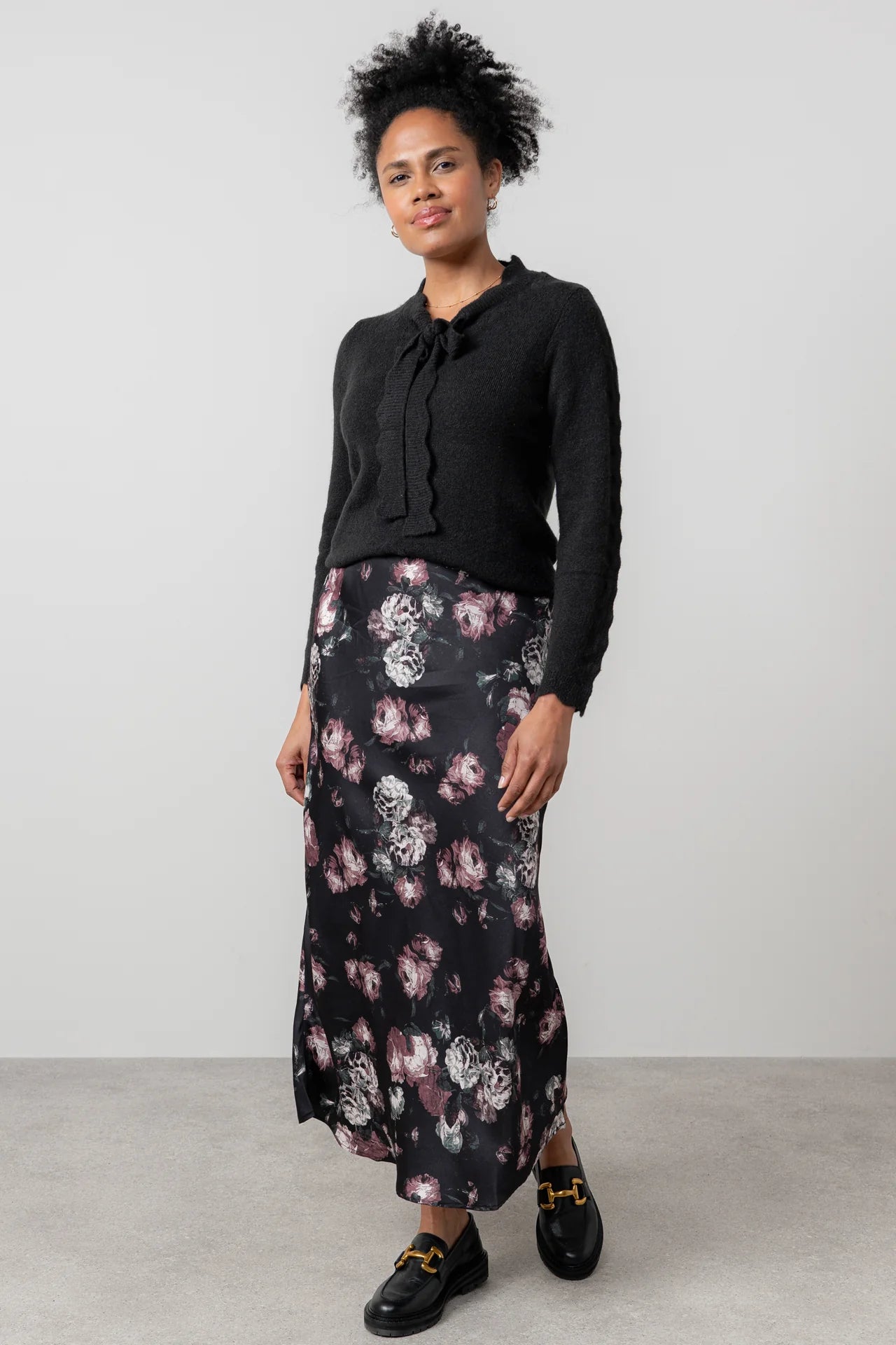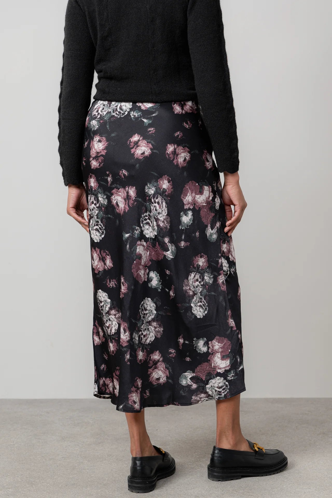 The Evelyn Skirt is a statement piece, made from sustainable Ecovero™ Viscose Satin. With a silky sheen on the outside and a soft crepe on the inside, this beautifully slouchy fabric lends itself to our bespoke large scale bloom.