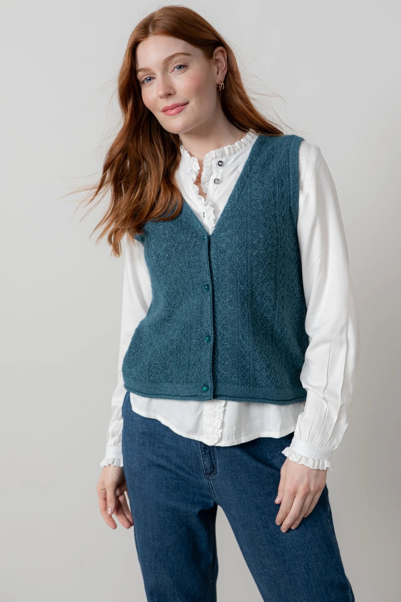Lily & Me Marly Sleeveless Knit Pointelle Cardigan Petrol