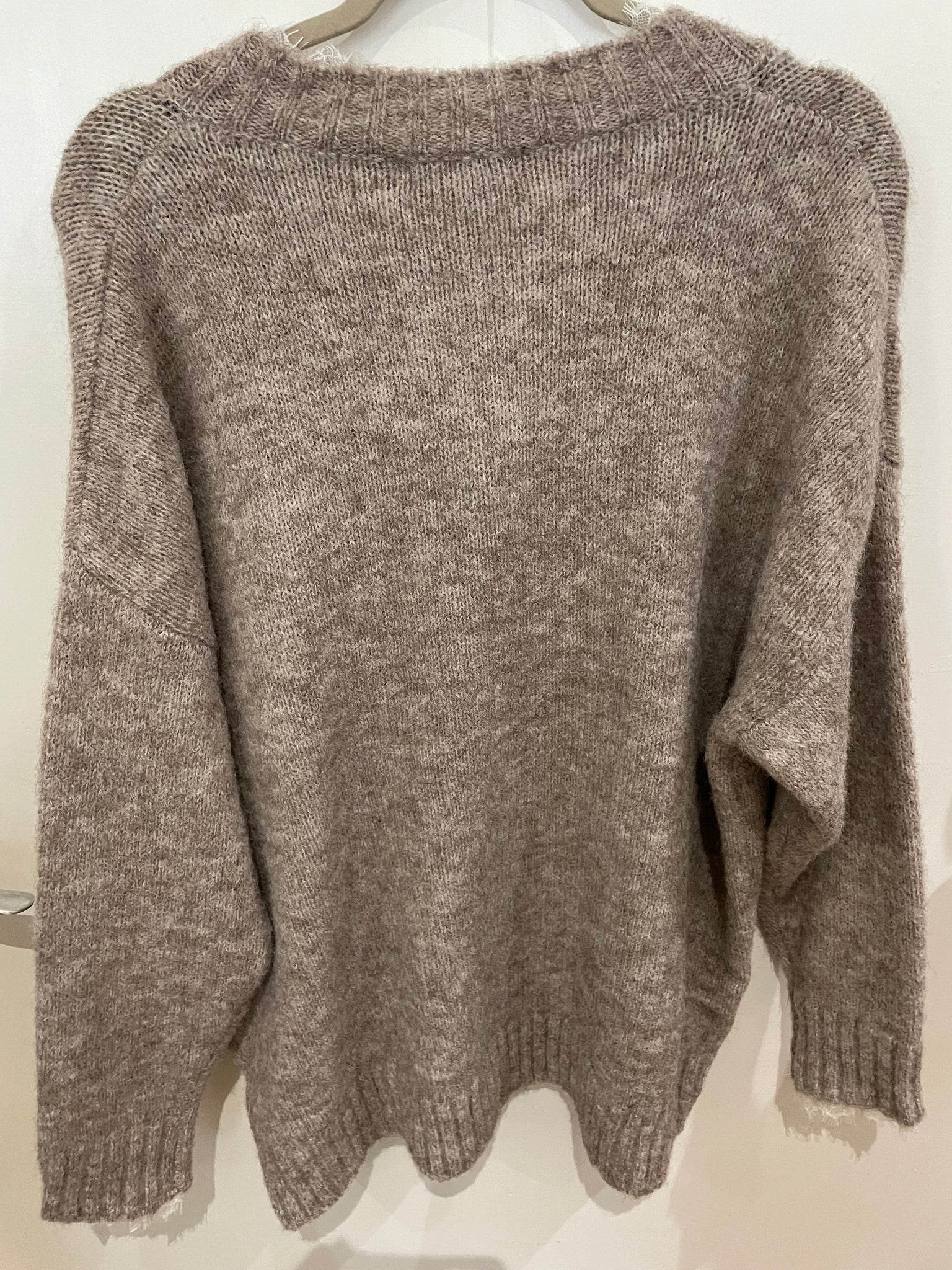 Taupe jumper with v neck and white lace trim to neckline and cuffs.