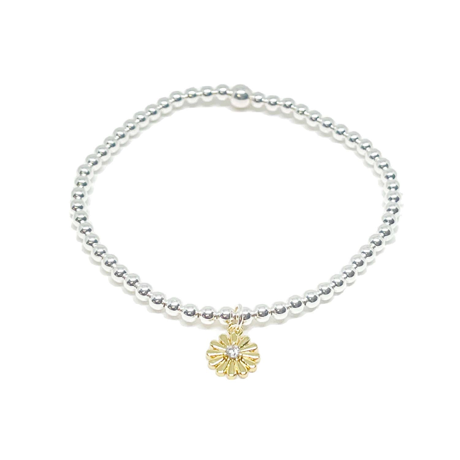 Gold flower charm on a silver plate beaded bracelet on stretch elastic.